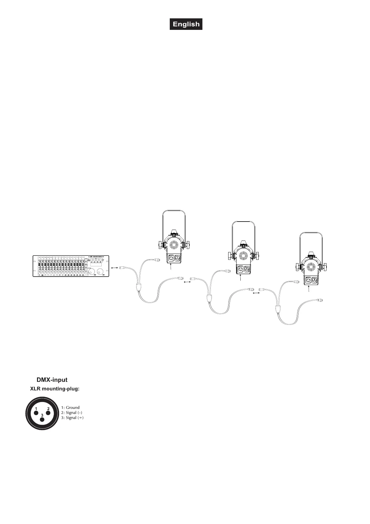 A DMX512 data link is required in order to control the device via DMX. The device provides a 3-pin XLR connector