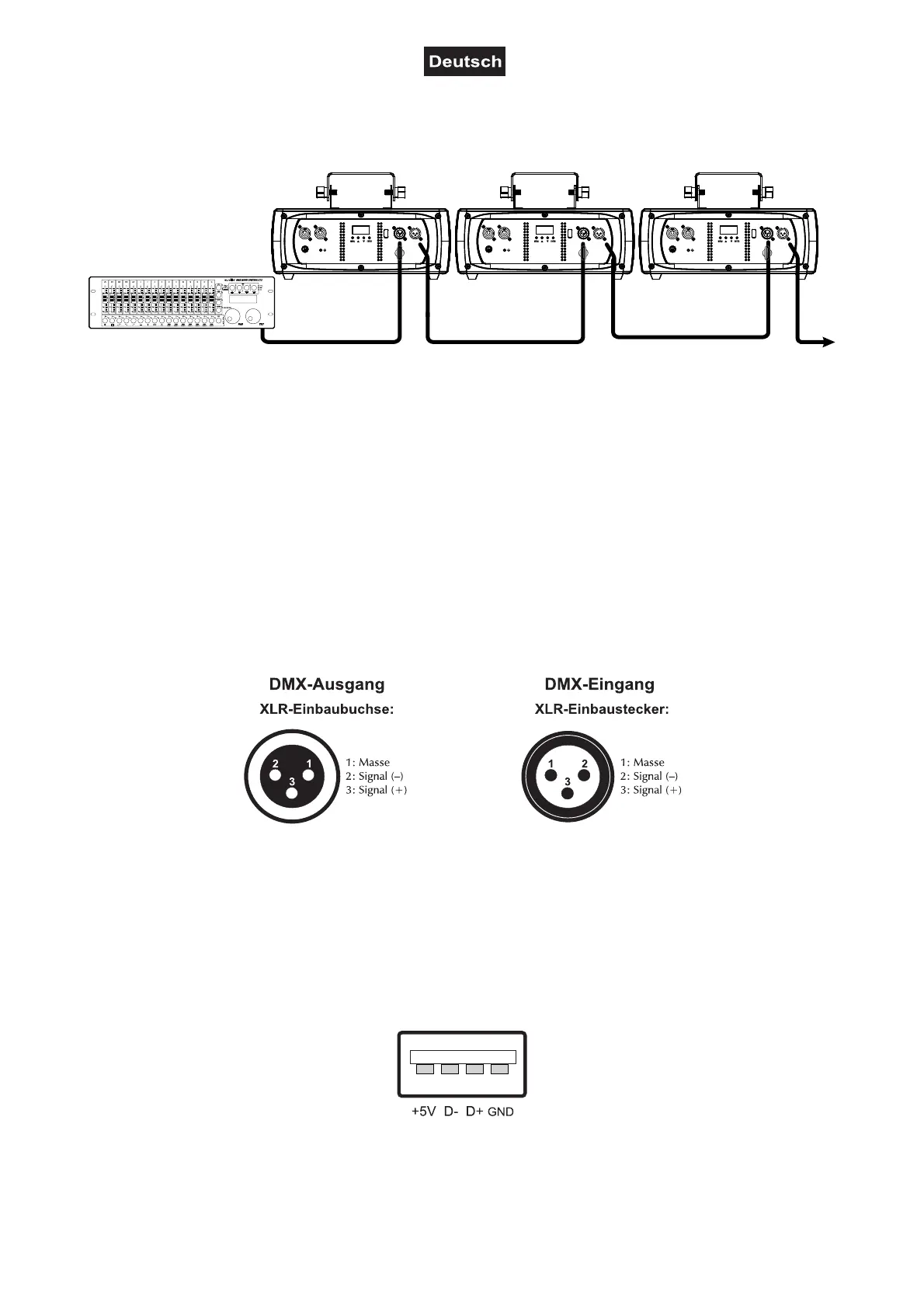 4 Ab einer Kabellänge von 300 m oder nach 32 angeschlossenen DMX-Geräten sollte das Signal mit Hilfe