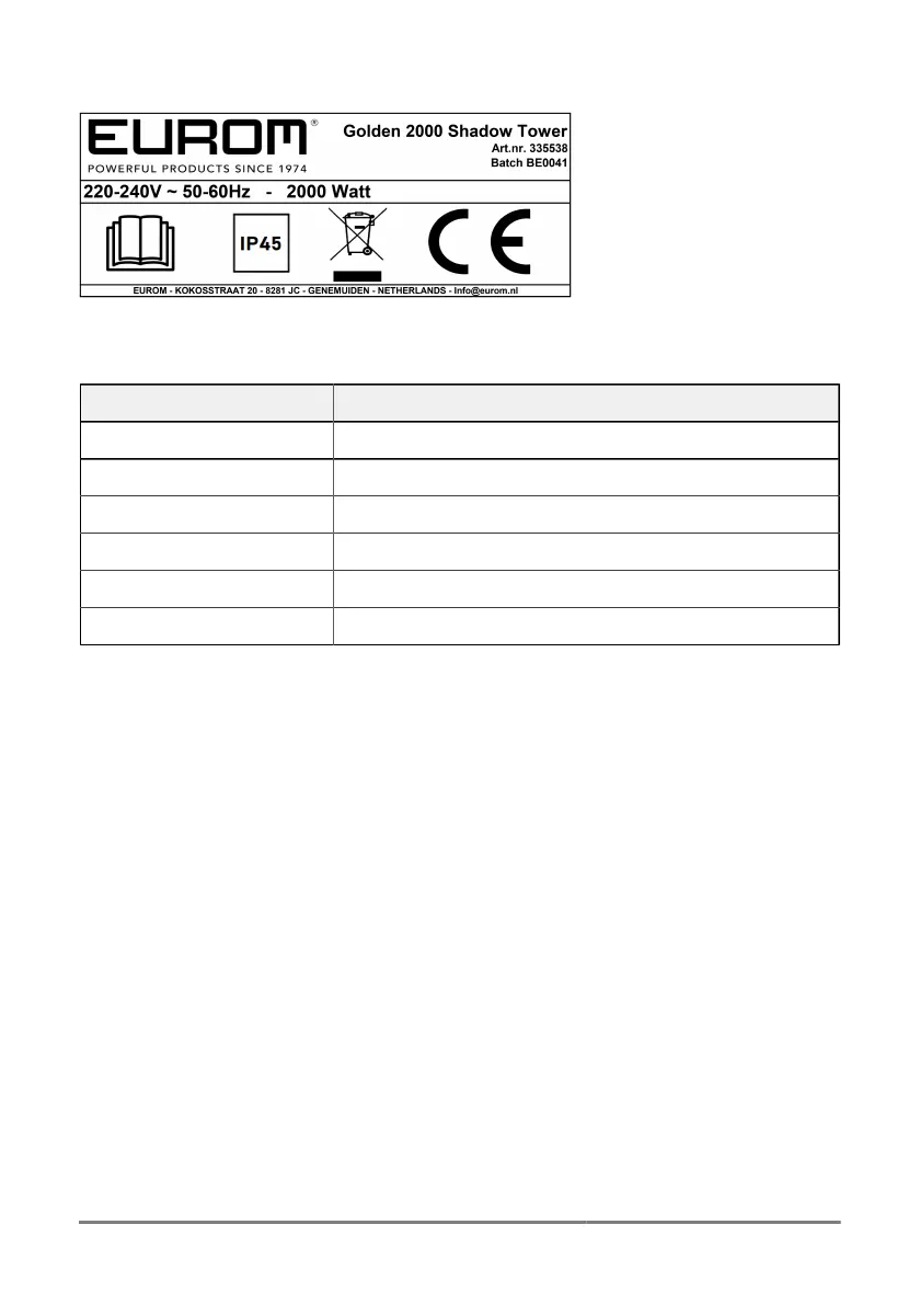 Bekijk gratis de handleiding van Eurom Golden 2000 Shadow Tower, stel vragen en lees de antwoorden op veelvoorkomende problemen, of gebruik onze assistent om sneller informatie in de handleiding te vinden of uitleg te krijgen over specifieke functies.
