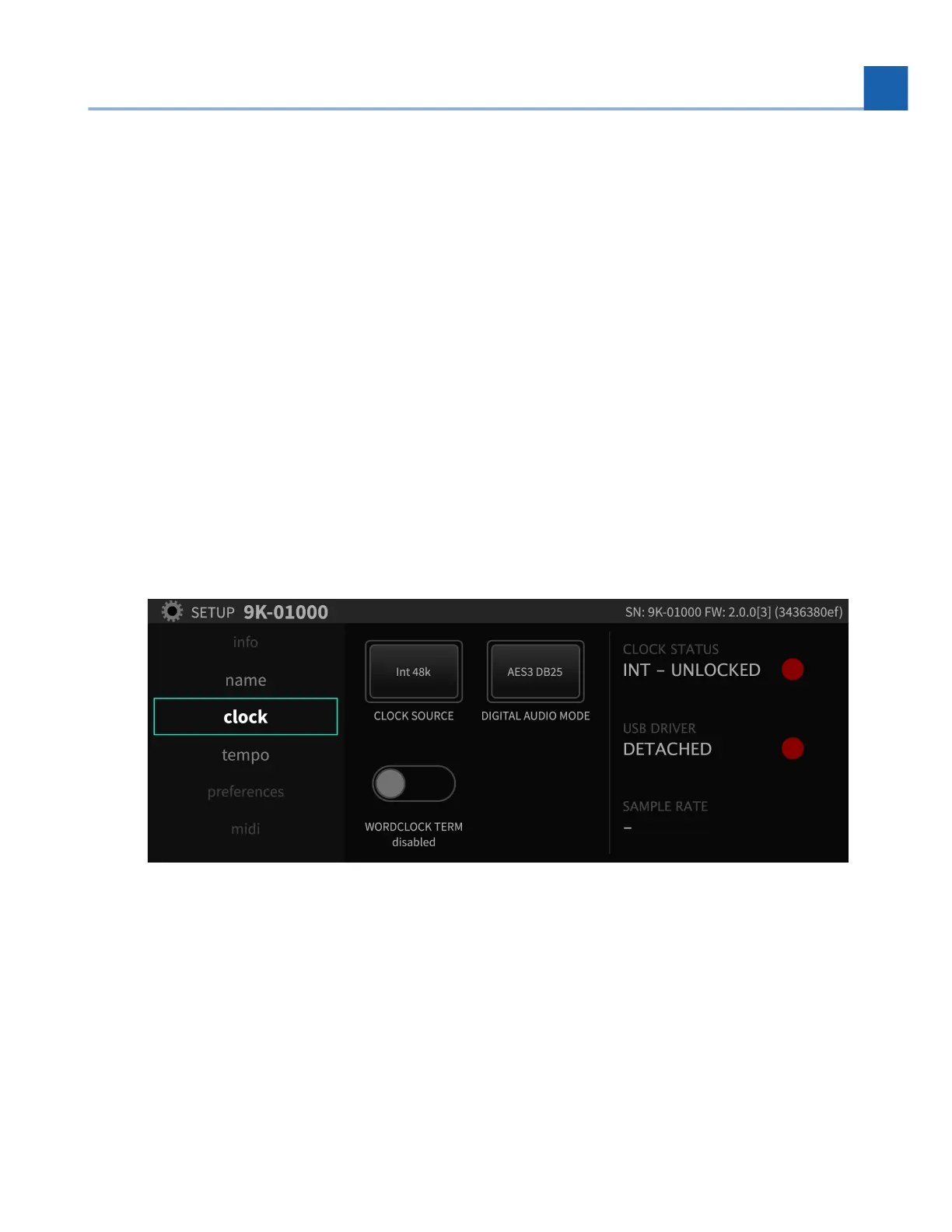 The Clock menu is where you will set the unit’s sample rate and digital audio mode.