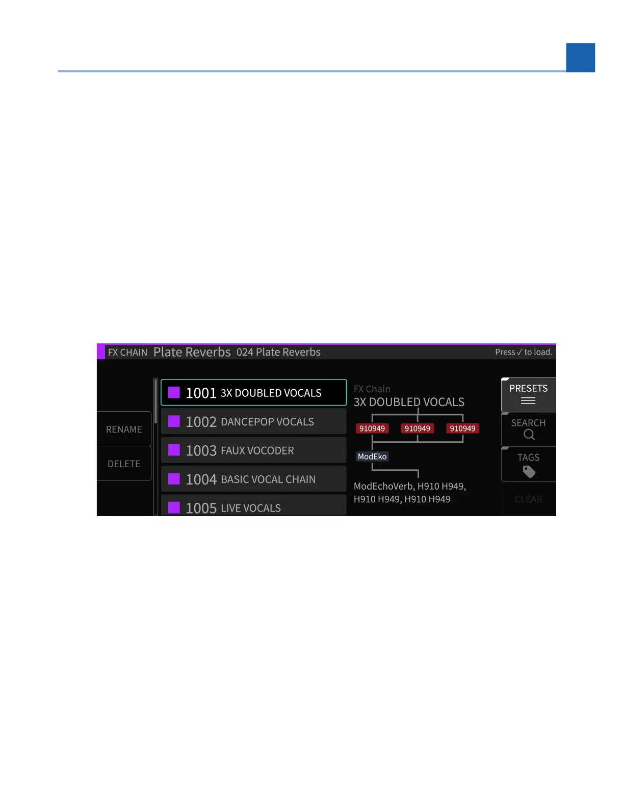 The middle secon of the FX chain block shows the algorithm(s) that make up the current FX chain. To