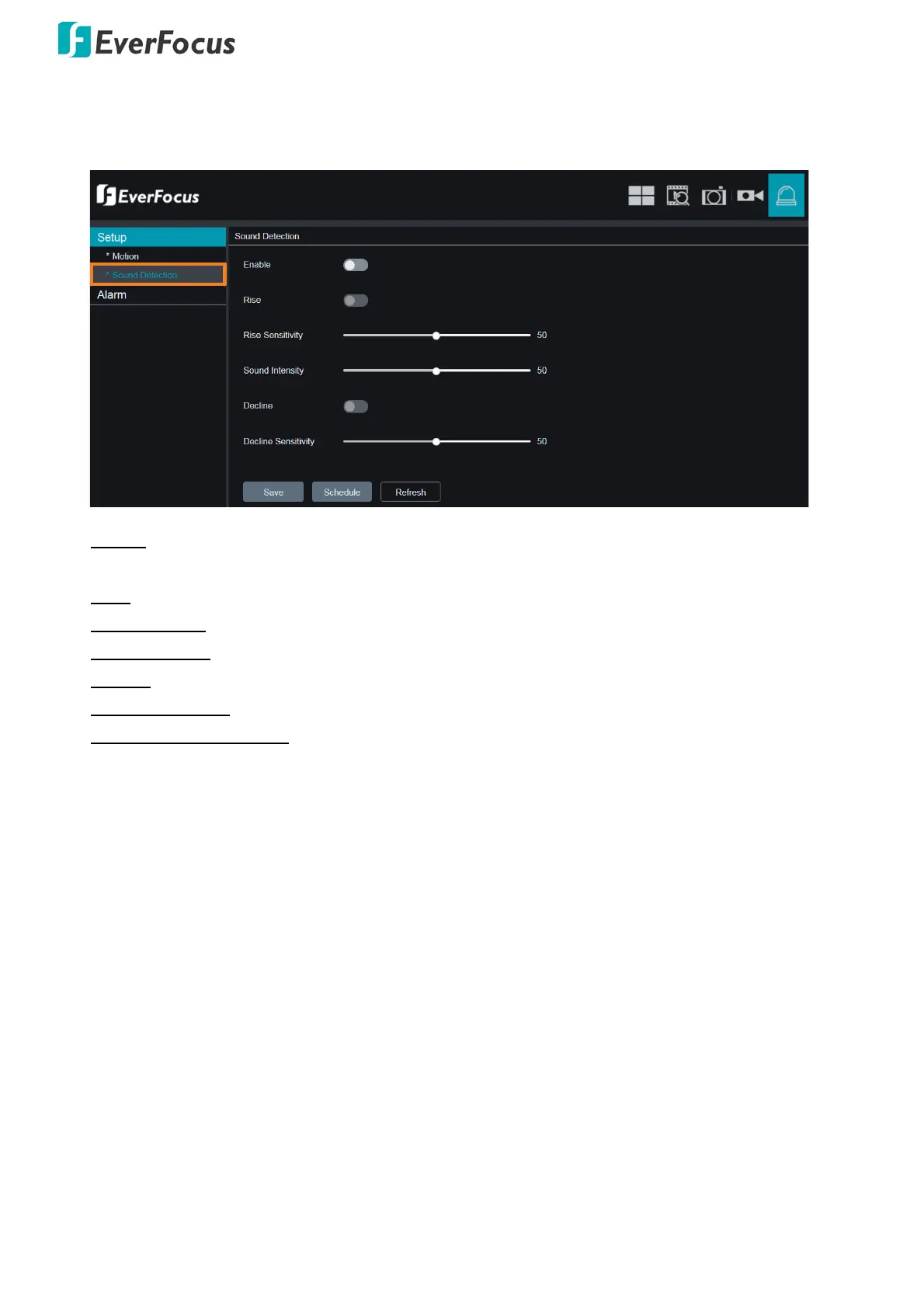 Enable: Switch the button to the right to enable the Sound Detection function. And then configure the