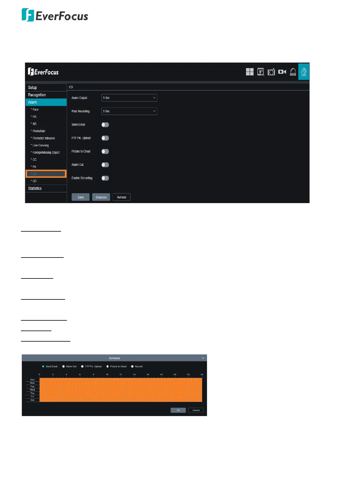 Post Recording: After triggered alarm, the post record time, selected time period is OFF, 5S, 10S, 20S,