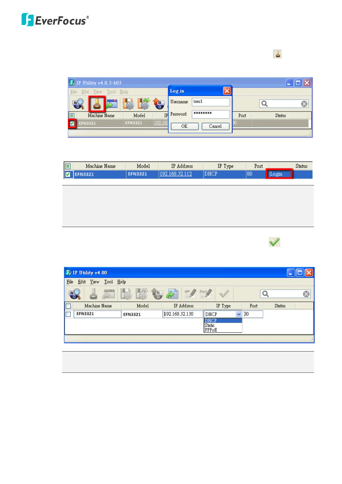a. Log in the camera by checking the desired model and then click the Log in icon. The Log