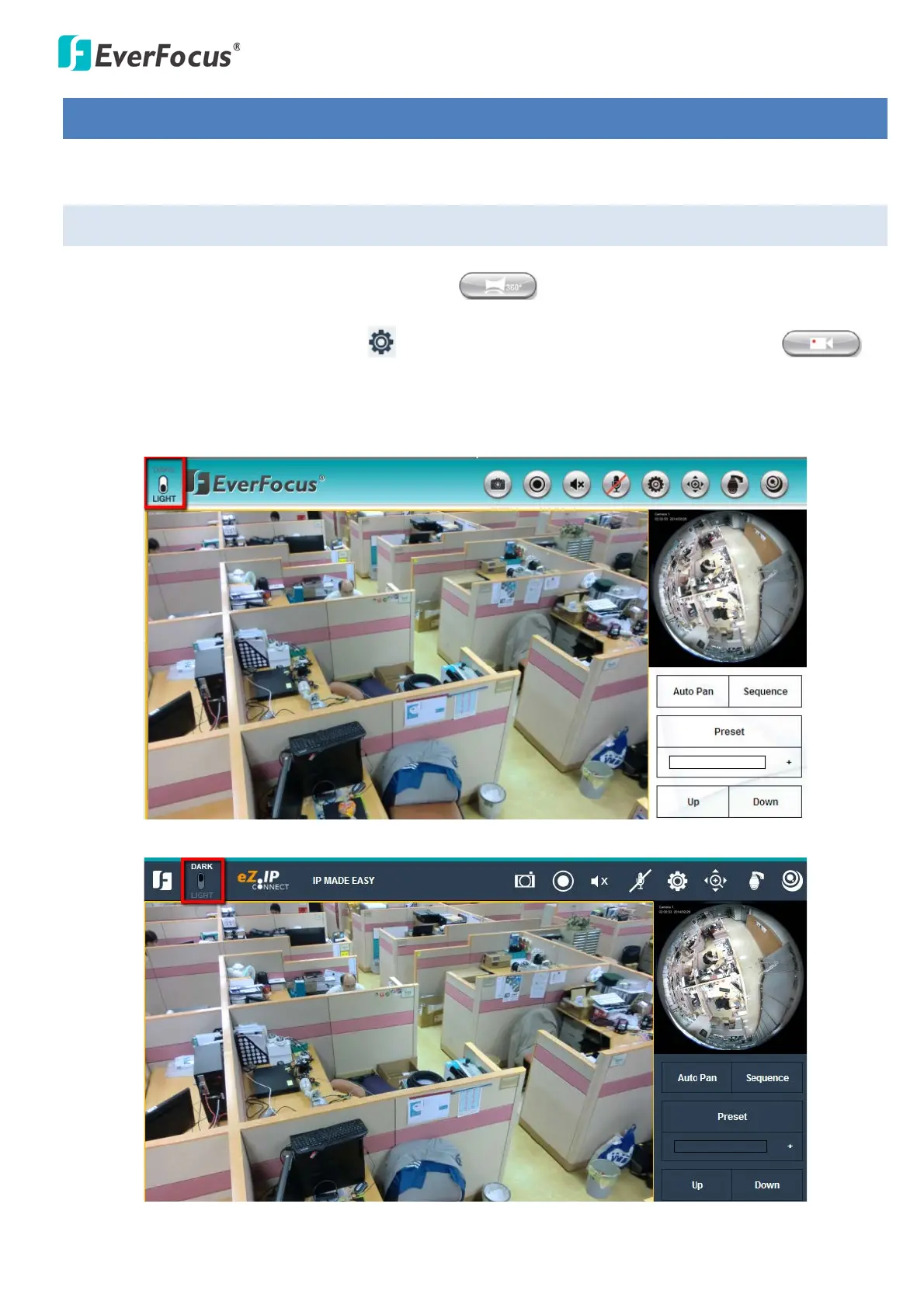 The Fisheye Settings page is designed with two styles: Dark and Light. You can switch between the two
