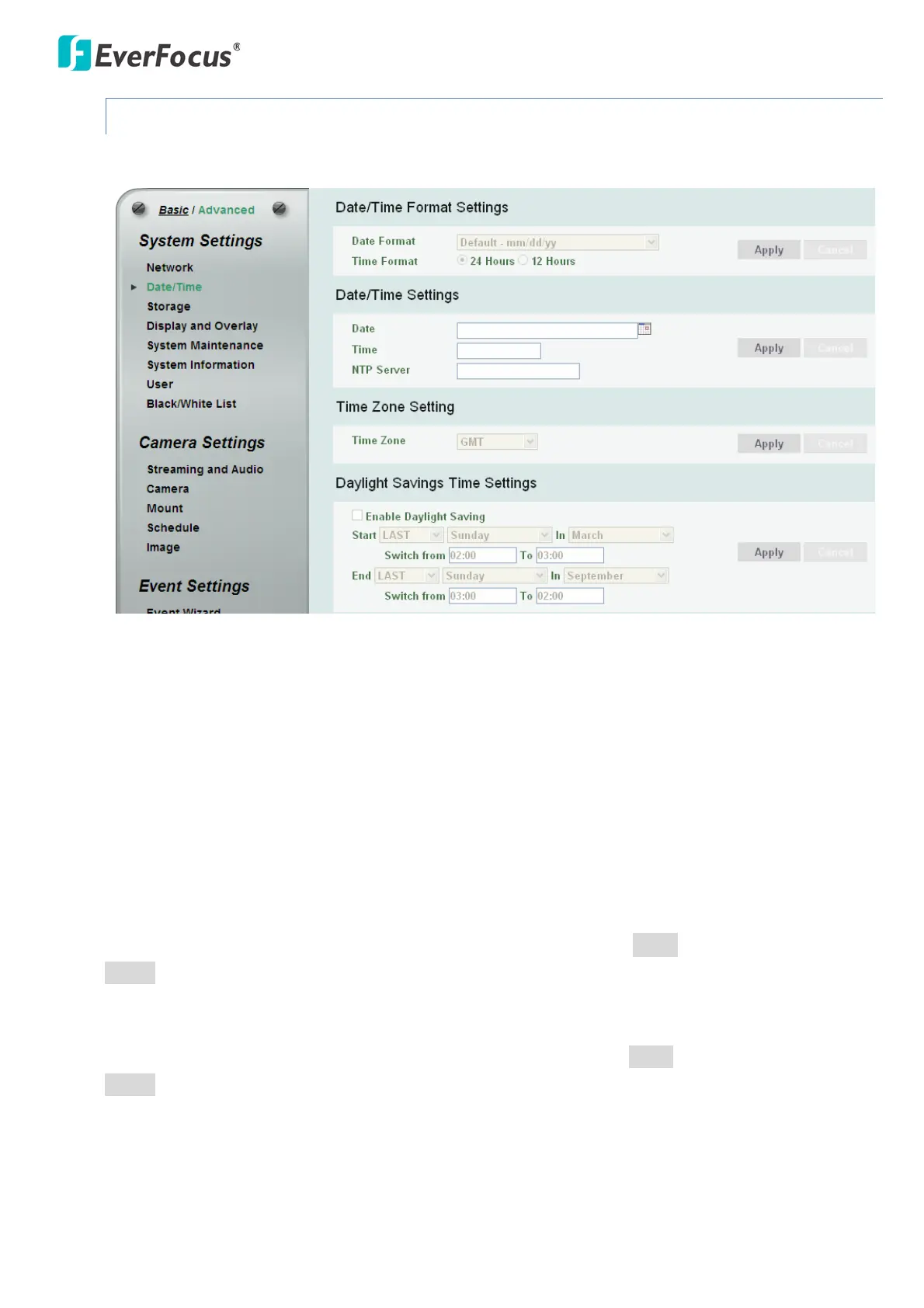 【Time Zone Setting】Set the time zone of the camera’s location. Click Apply to apply the changes or
