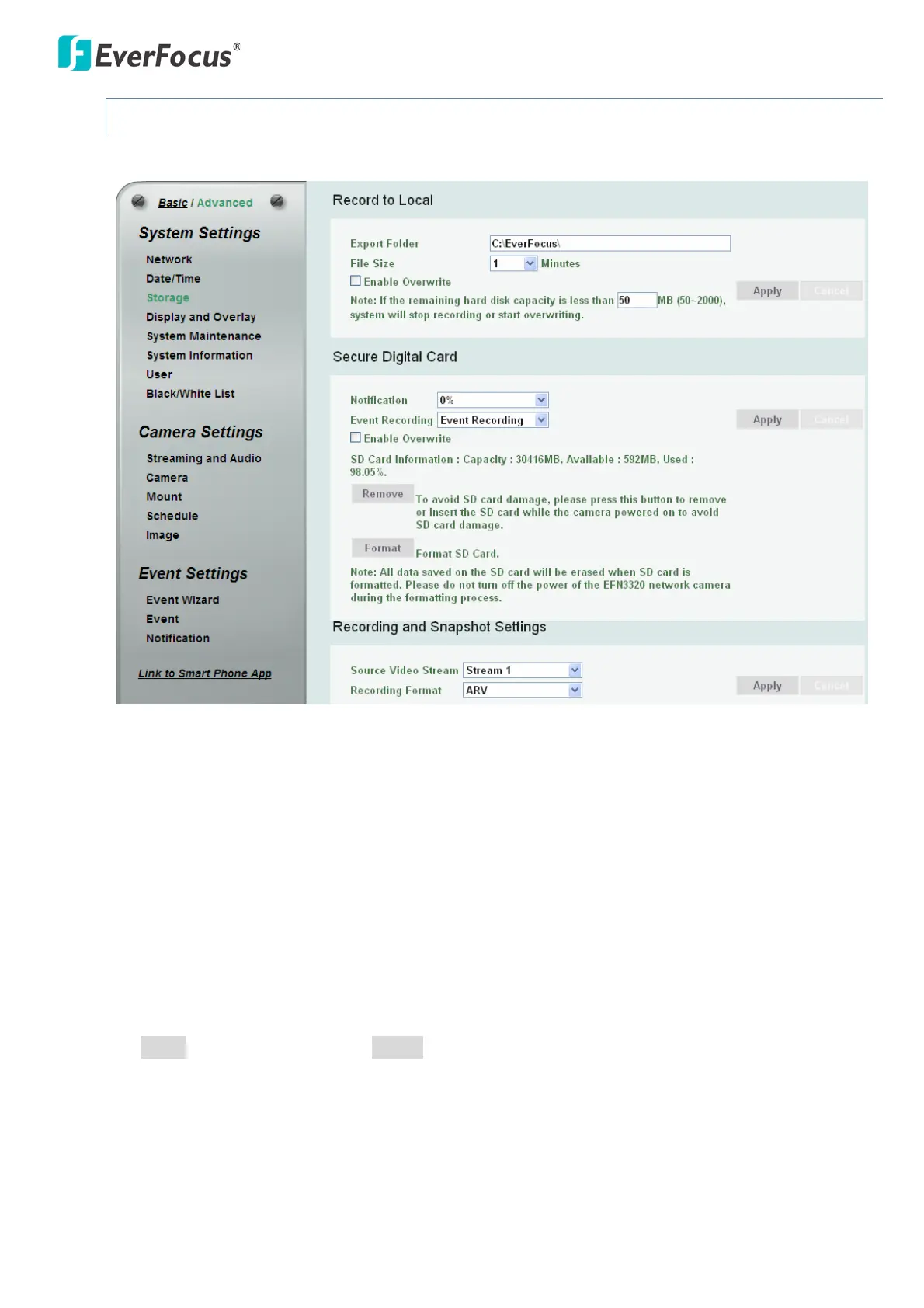You can configure the recording path / format, source video stream and SD card settings on this page.