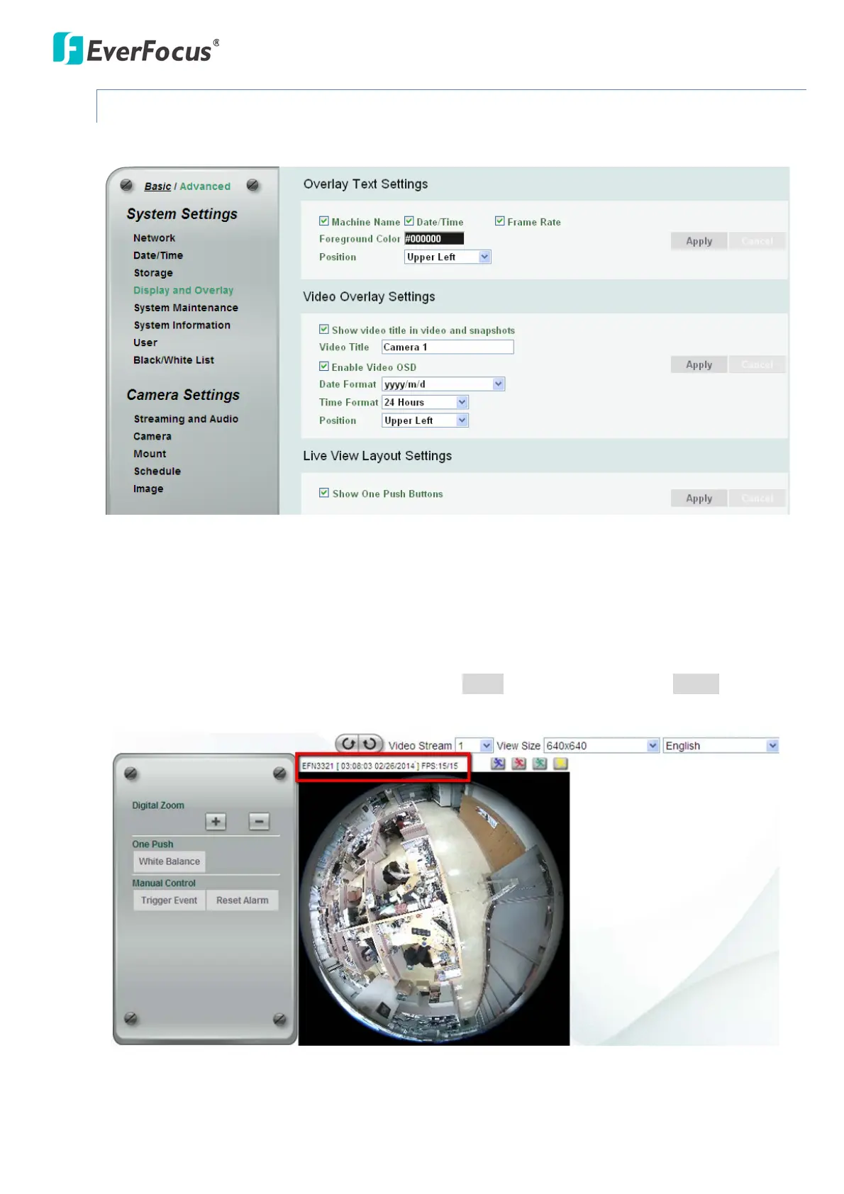 【Overlay Text Settings】Check the boxes to display the information on the Live View Window. The