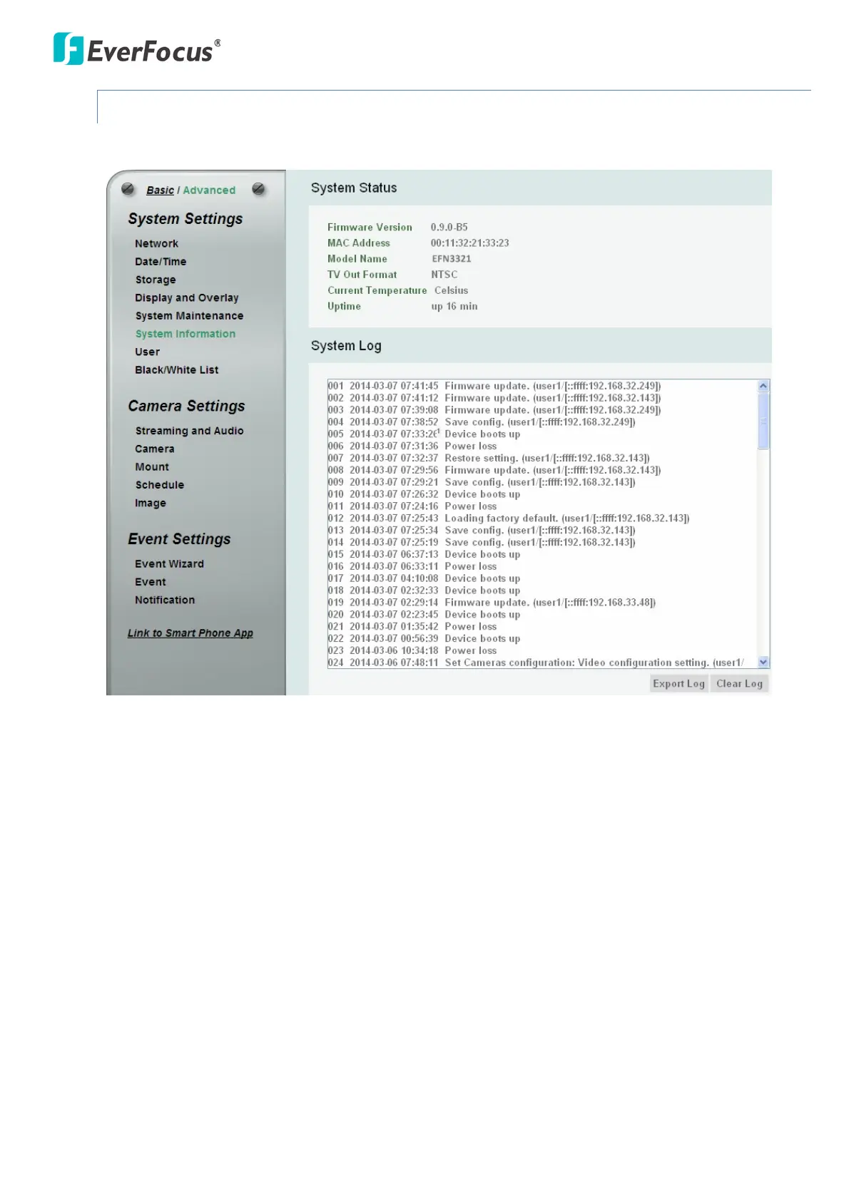 will display the last 256 log events. Click the Export Log button to export the system log event list into