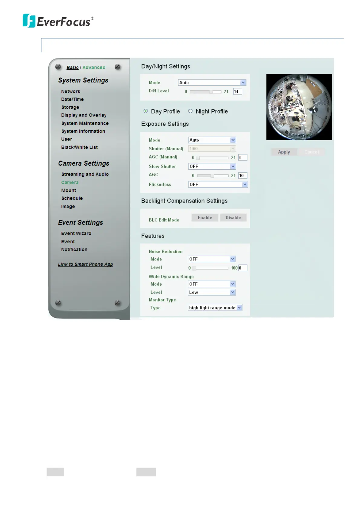 field. Adjust the level for the camera to switch between day mode and night mode automatically.