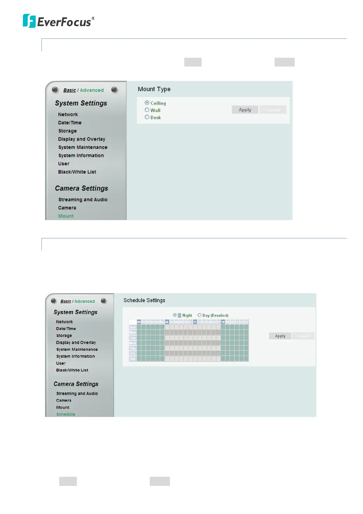 Select the mounting type of your camera. Click Apply to apply the changes or Cancel to cancel the
