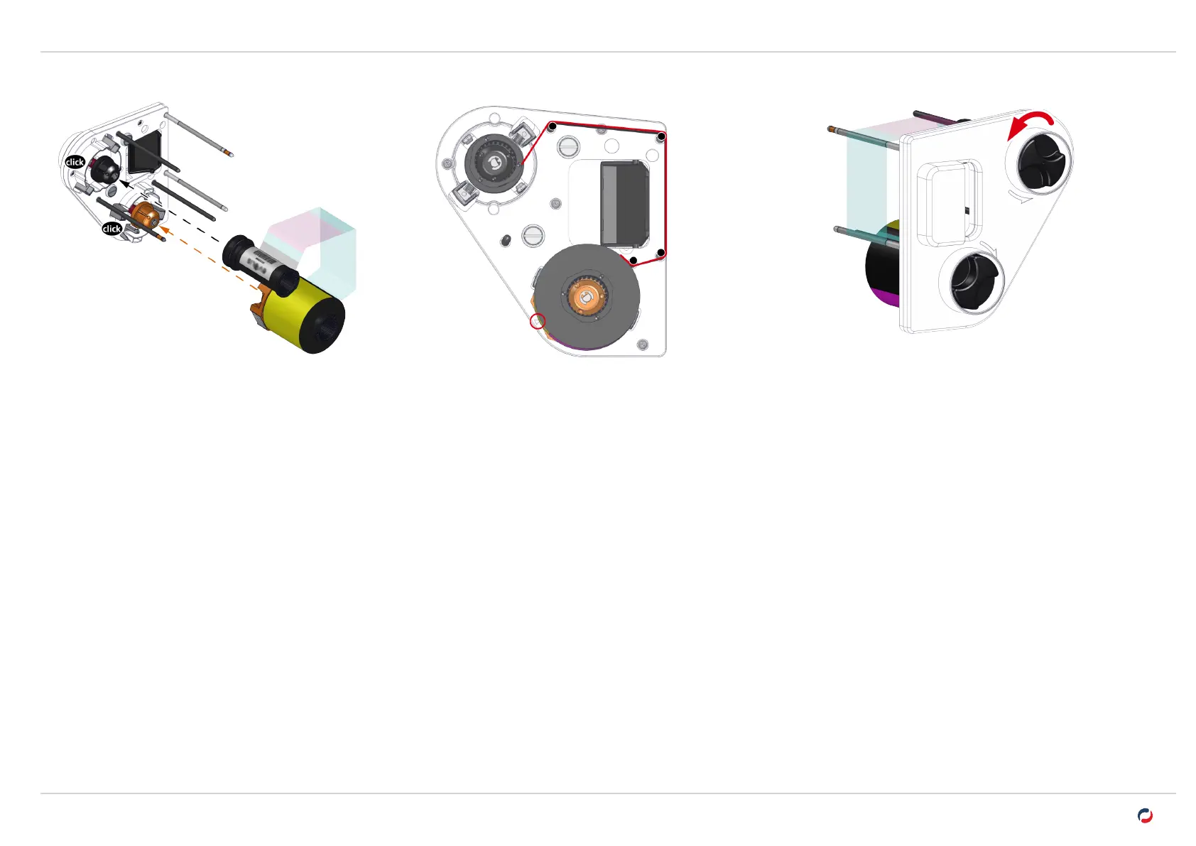 5. Plaats de (volle) beginrol van het lint op de oranje spoel. Het lint rolt naar boven af. Een