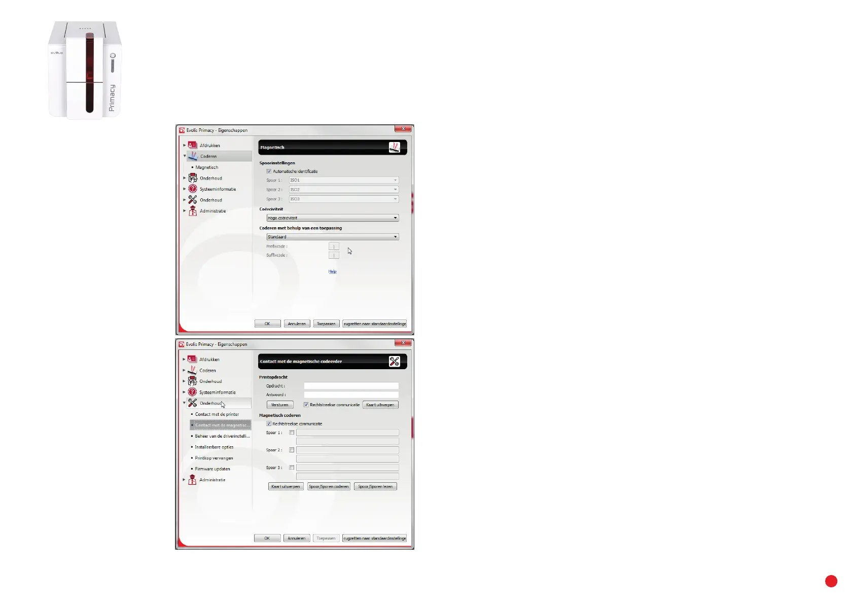 de magnetische codeerder zijn beschikbaar vanuit de Eigenschappen van het Evolis Print Center door rechts te klikken op de naam van de printer.