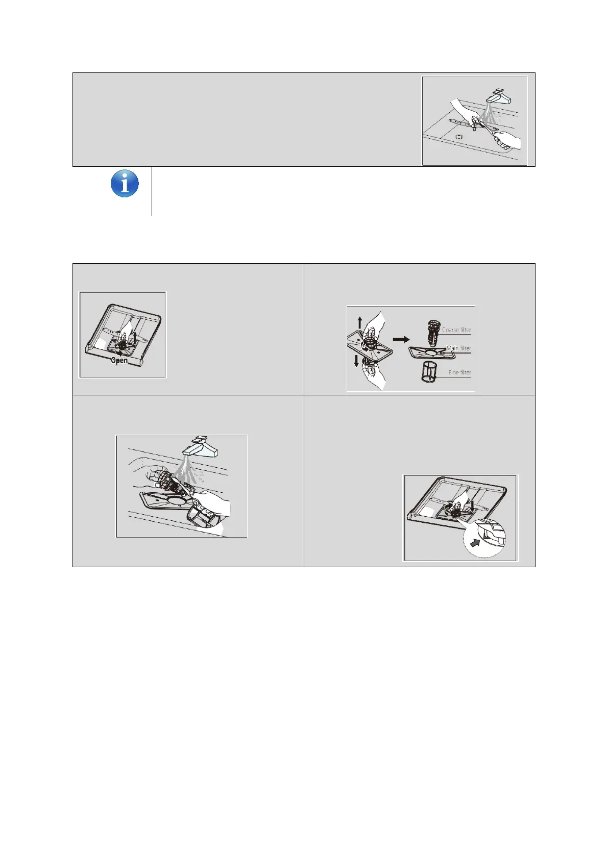Connect the inlet hose to the inlet valve again. Remove the filter from the tray in the