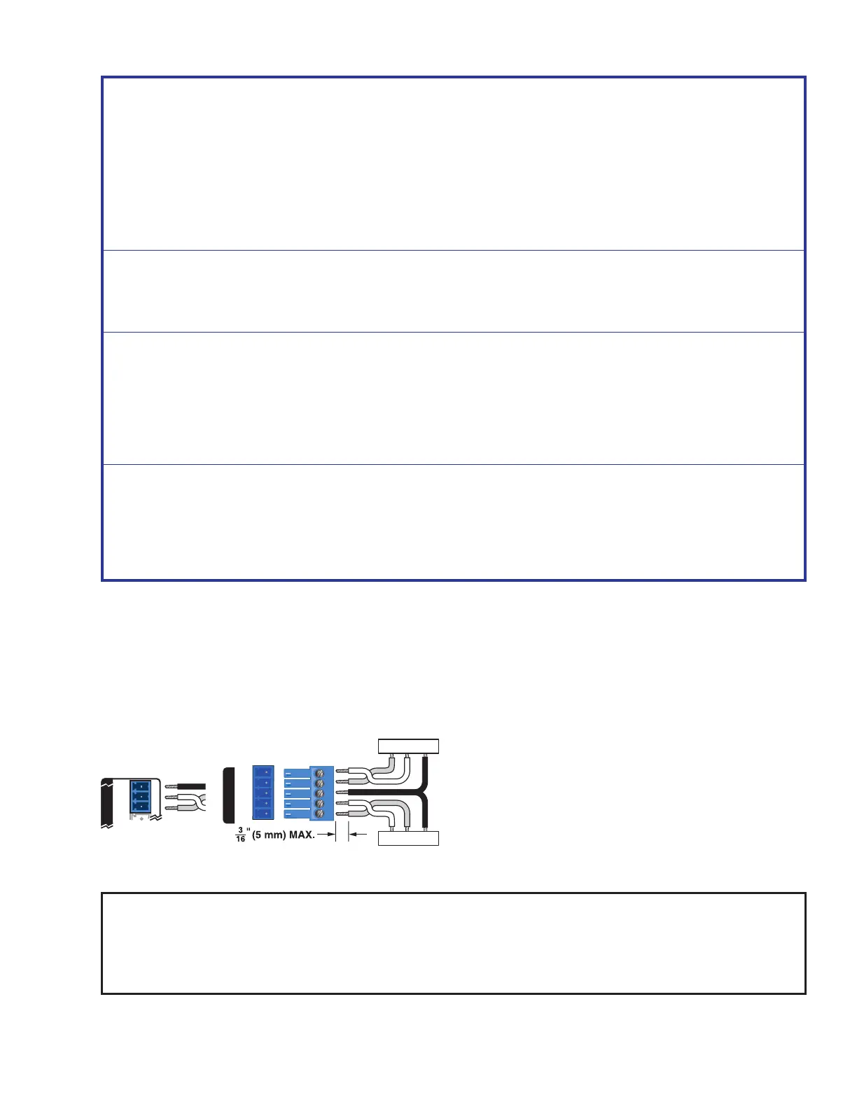 • The length and preparation of exposed wires is important (see the second and third power Caution on