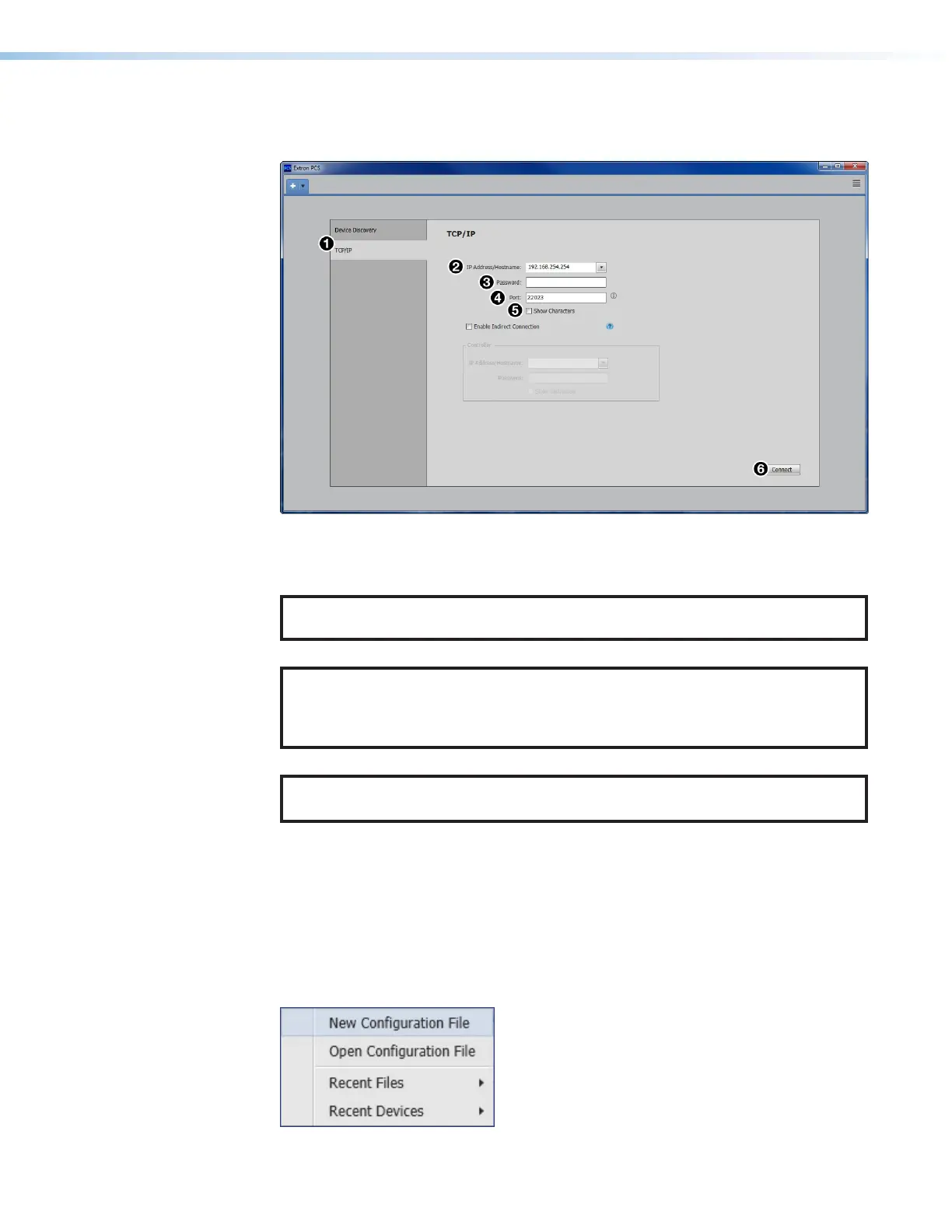 The TCP/IP panel connects PCS to a specific device through Ethernet or USB over IP.