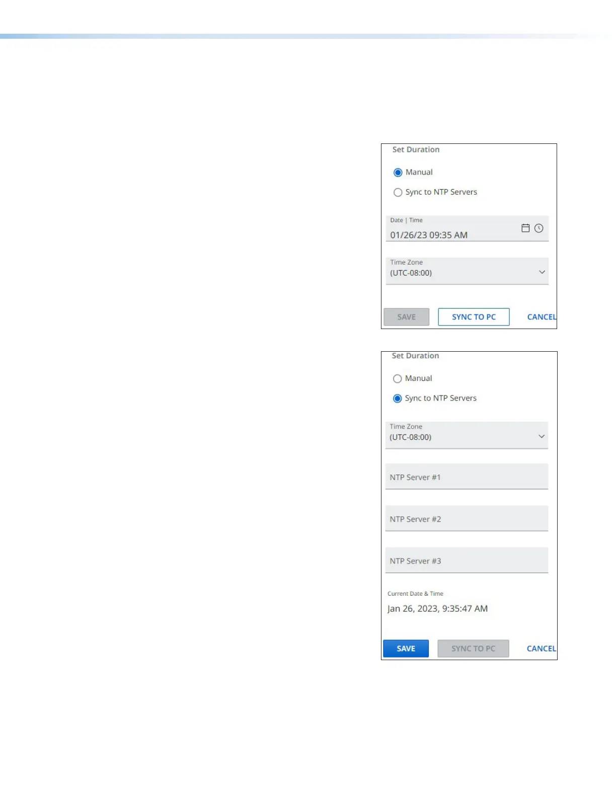 and time: manual mode, sync to NTP (Network Time Protocol) servers, and sync to the