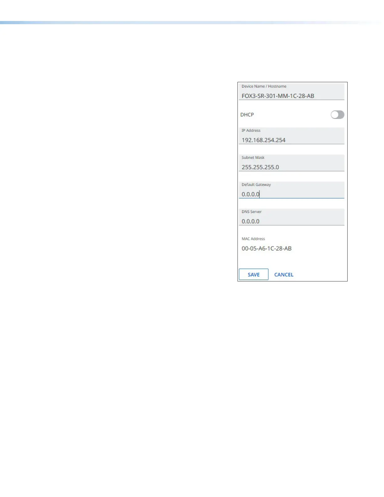 device name, set the IP address, subnet mask, and DNS server for your FOX3 SR, or turn