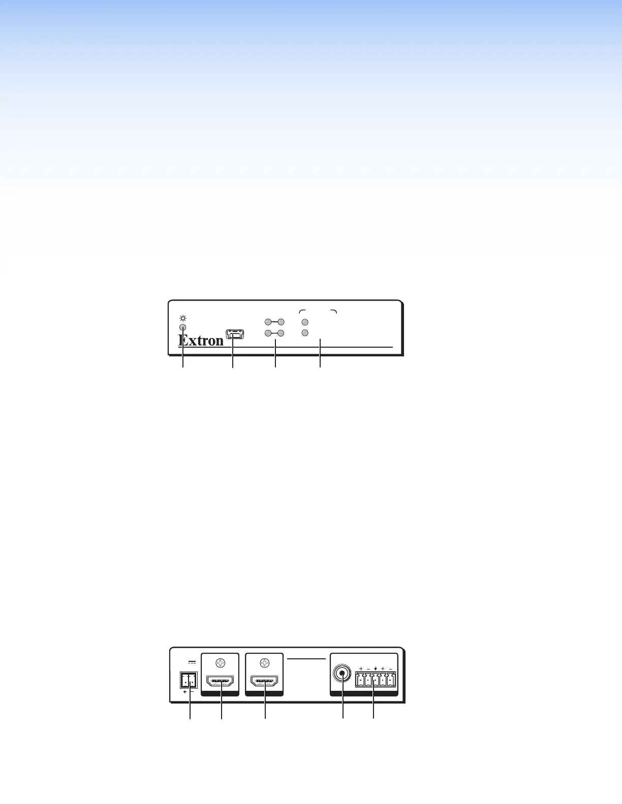 Input and Output LEDs — These four LEDs provide the status of the HDMI input: