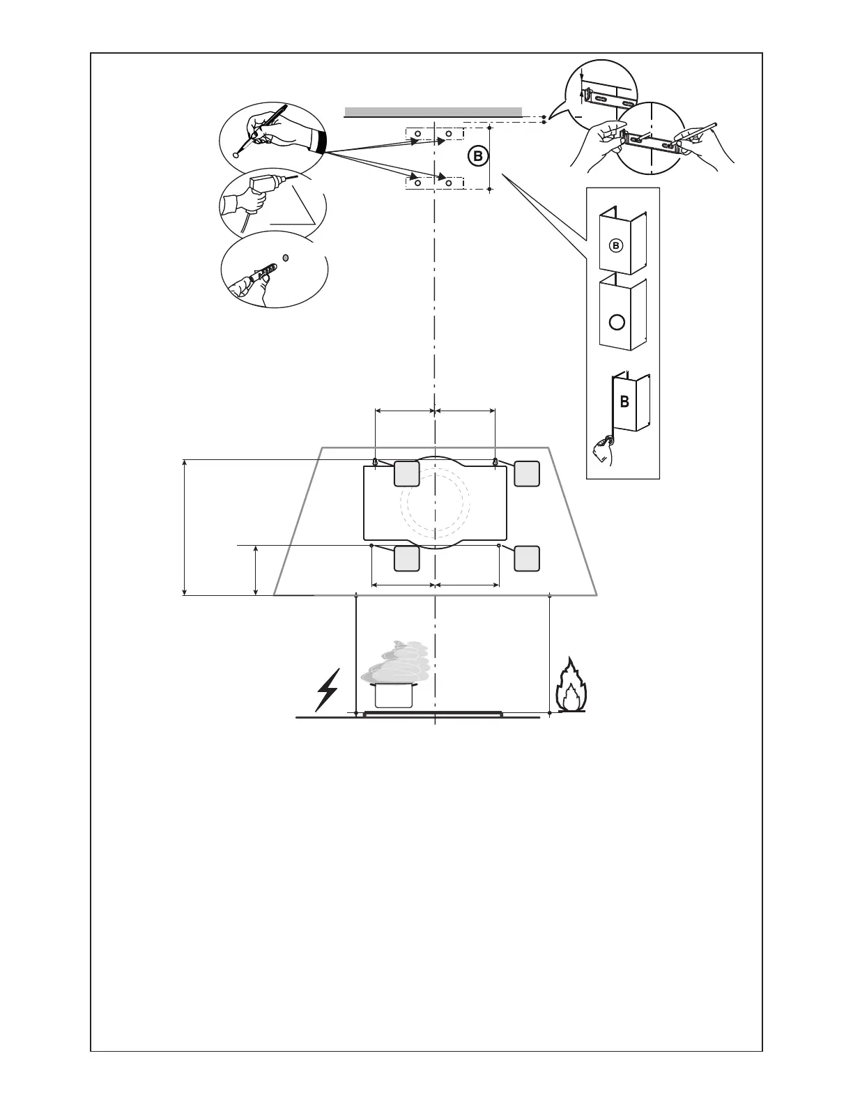 Marque la pared donde se indica (B), 3 15/16" por encima de la línea horizontal y a una distancia de 8 11/16" a la izquierda
