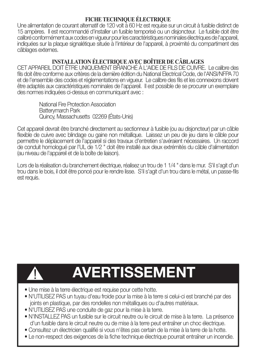 • Le non-respect des exigences de la che technique électrique pourrait entraîner un incendie.