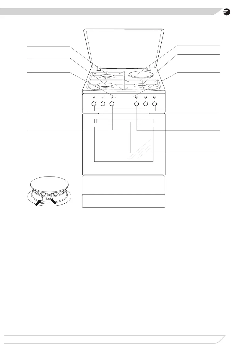 3, 4, 5, 6: Manettes de commande des brûleurs à gaz et de la plaque électrique