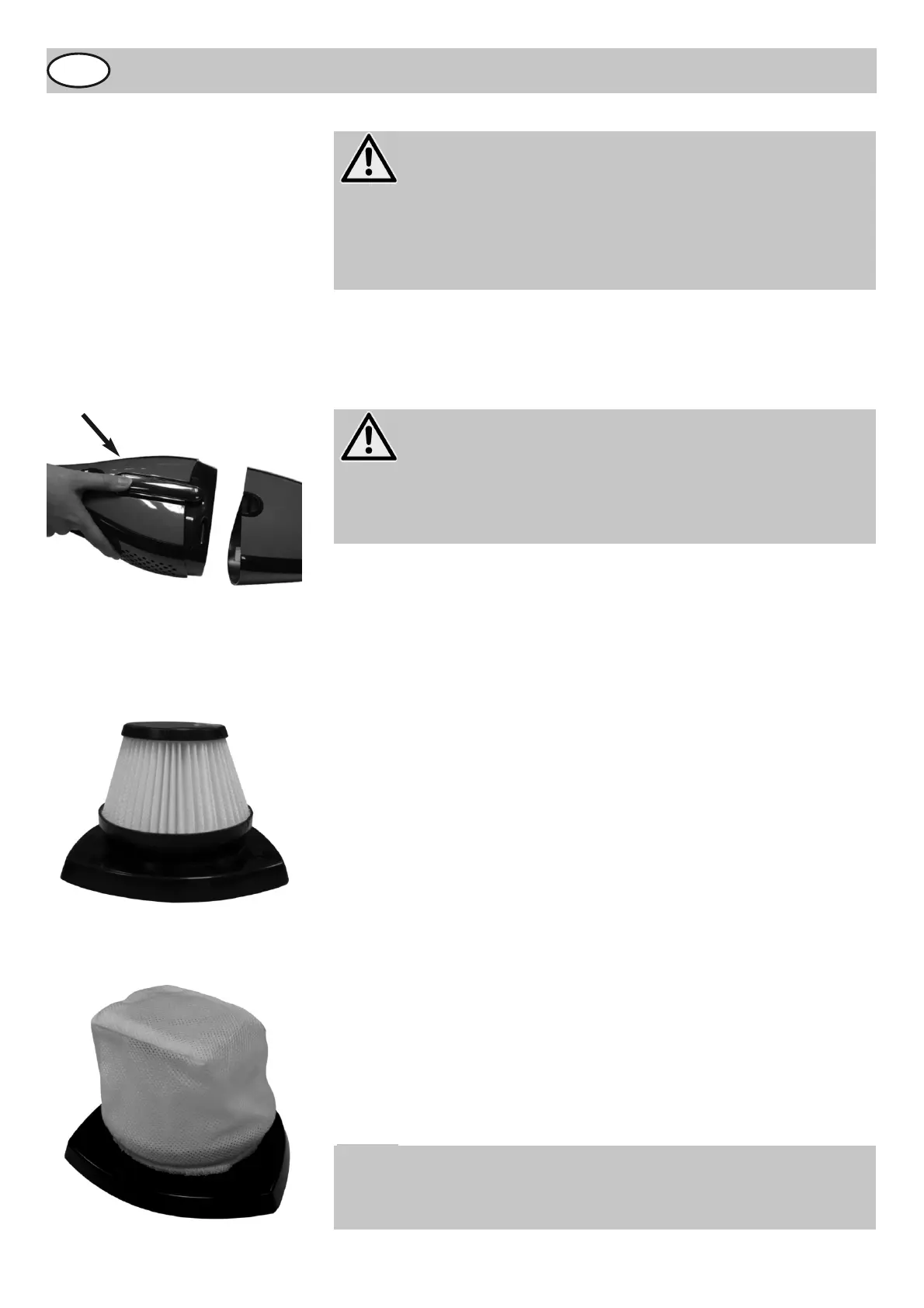 ● Before you insert the filters in the dust cup, make sure that