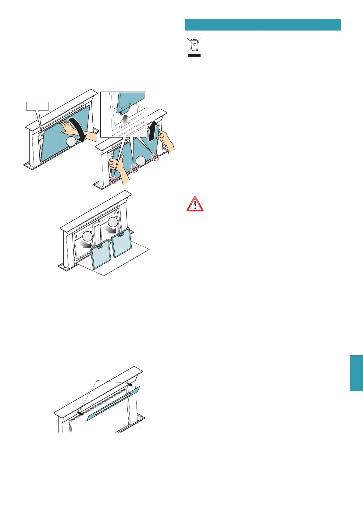 For udtagning og bisættelse af fedtfiltrene i metal, se monteringsvejledningen.