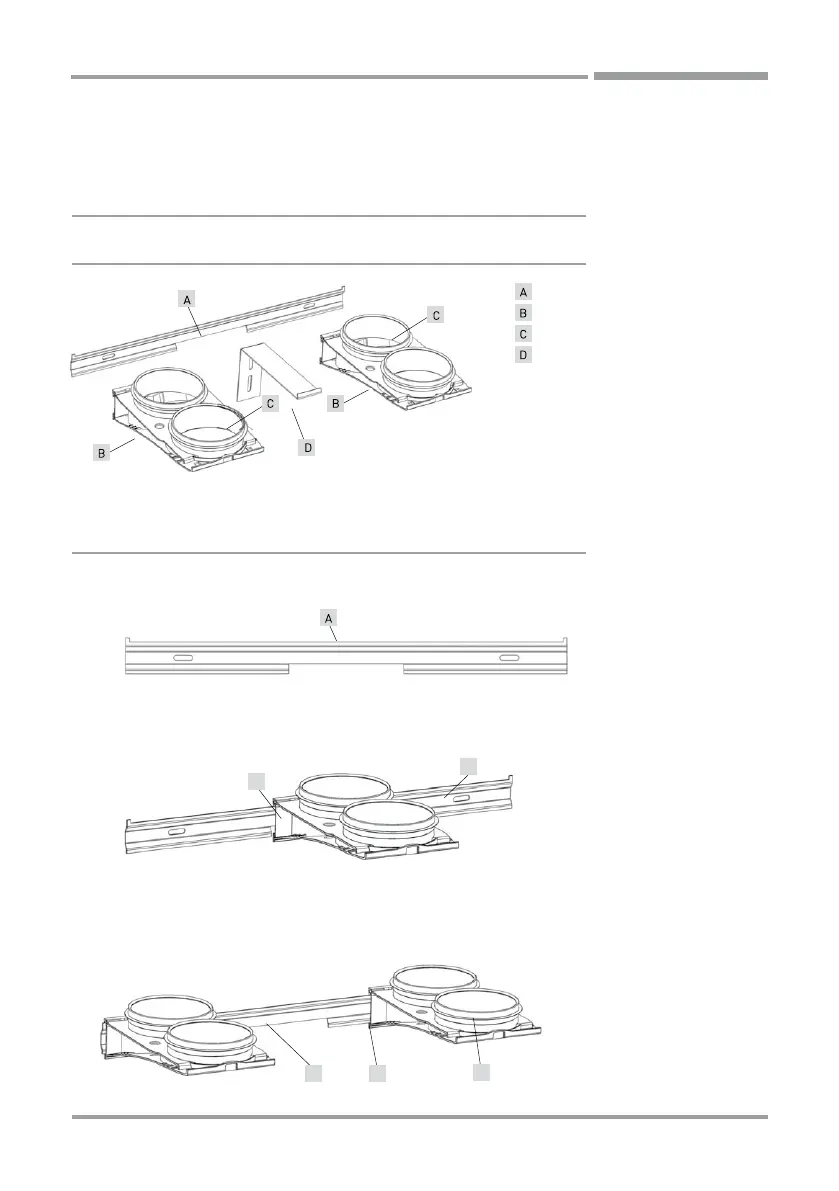 3. Assicurarsi che gli adattatori (B) siano posti a filo a ciascuna estremità della staffa di montaggio (A) e le