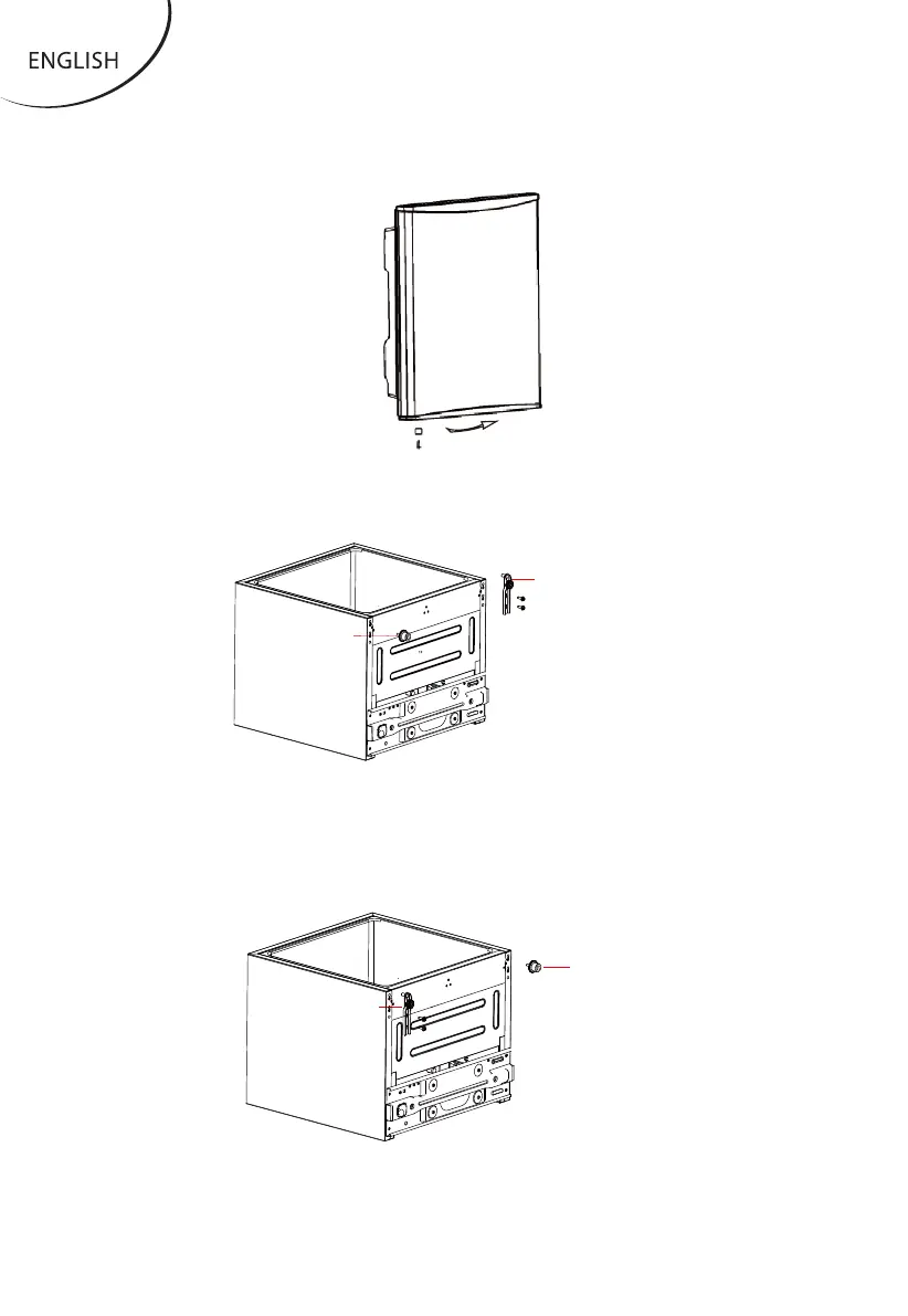 Install the lower hinge and levelling foot on lower left side of cabinet and lower right