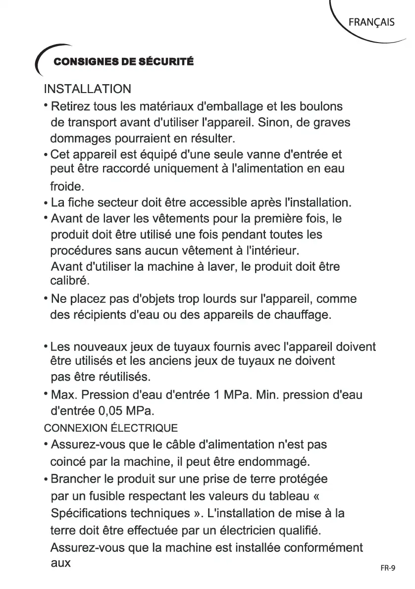 • Max. Pression d'eau d'entree 1 MPa. Min. pression d'eau