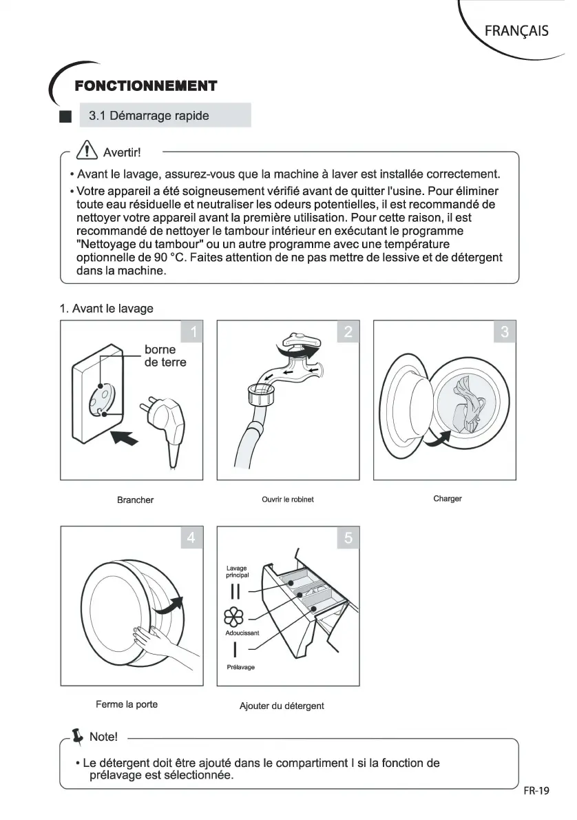 • Avant le lavage, assurez-vous que la machine a laver est installee correctement.