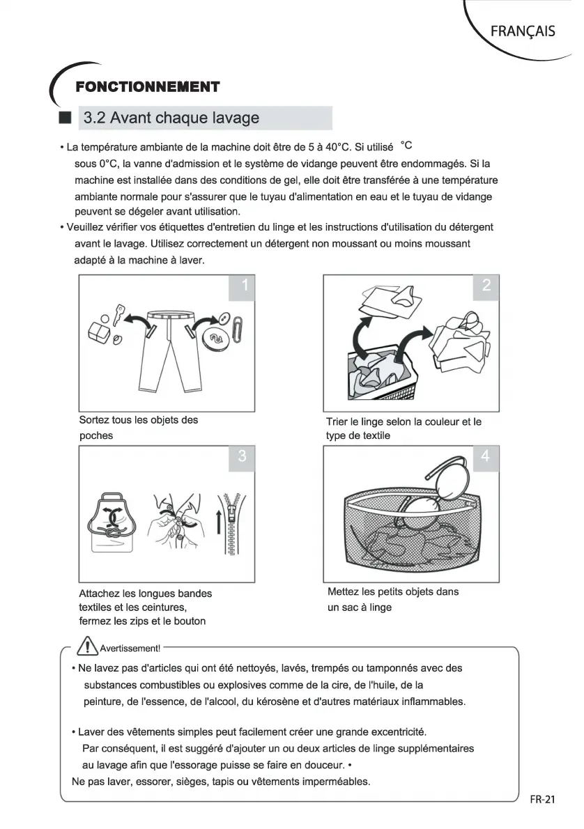 • Veuillez verifier vos etiquettes d'entretien du linge et les instructions d'utilisation du detergent