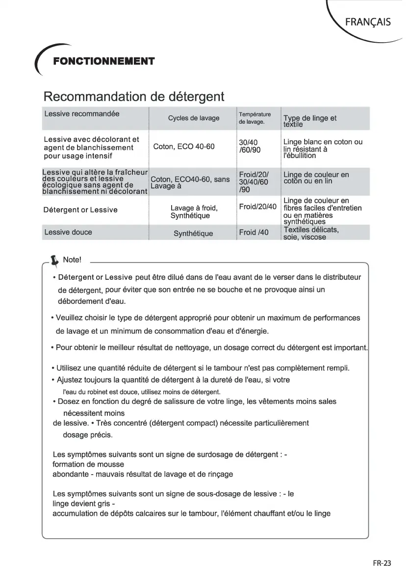 • Veuillez choisir le type de detergent approprie pour obtenir