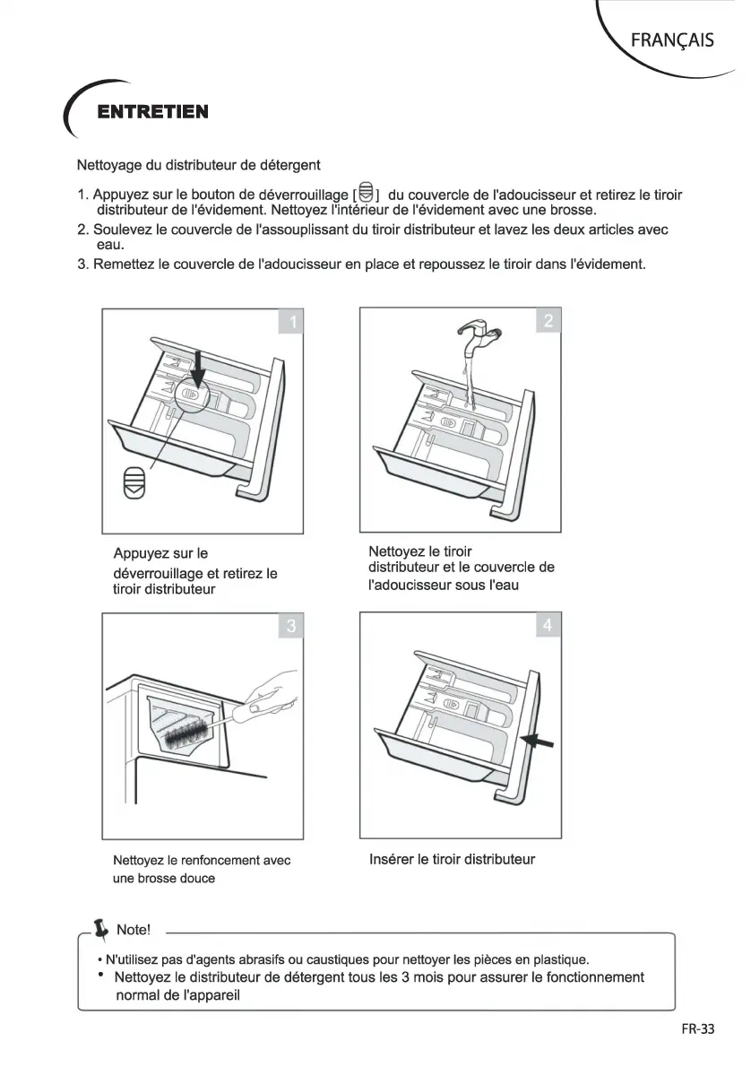 • Nettoyez le distributeur de detergent tous les 3 mois pour assurer le fonctionnement