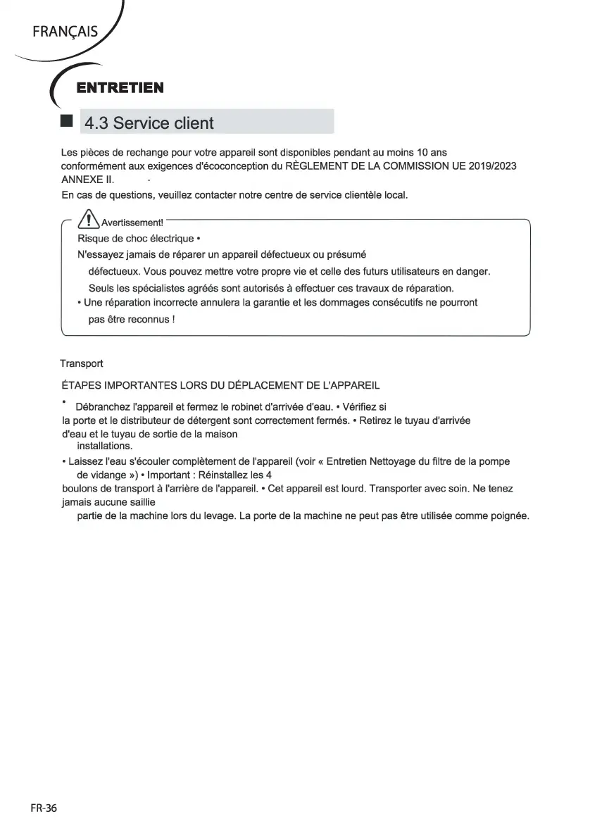 Les pieces de rechange pour votre appareil sont disponibles pendant au moins 10 ans