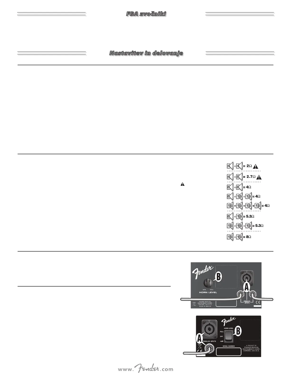 za vaš ojačevalec. OPOMBA: Vsi Fender® basovski zvočniki (in večina drugih znamk) so vezani paralelno (ne v seriji).