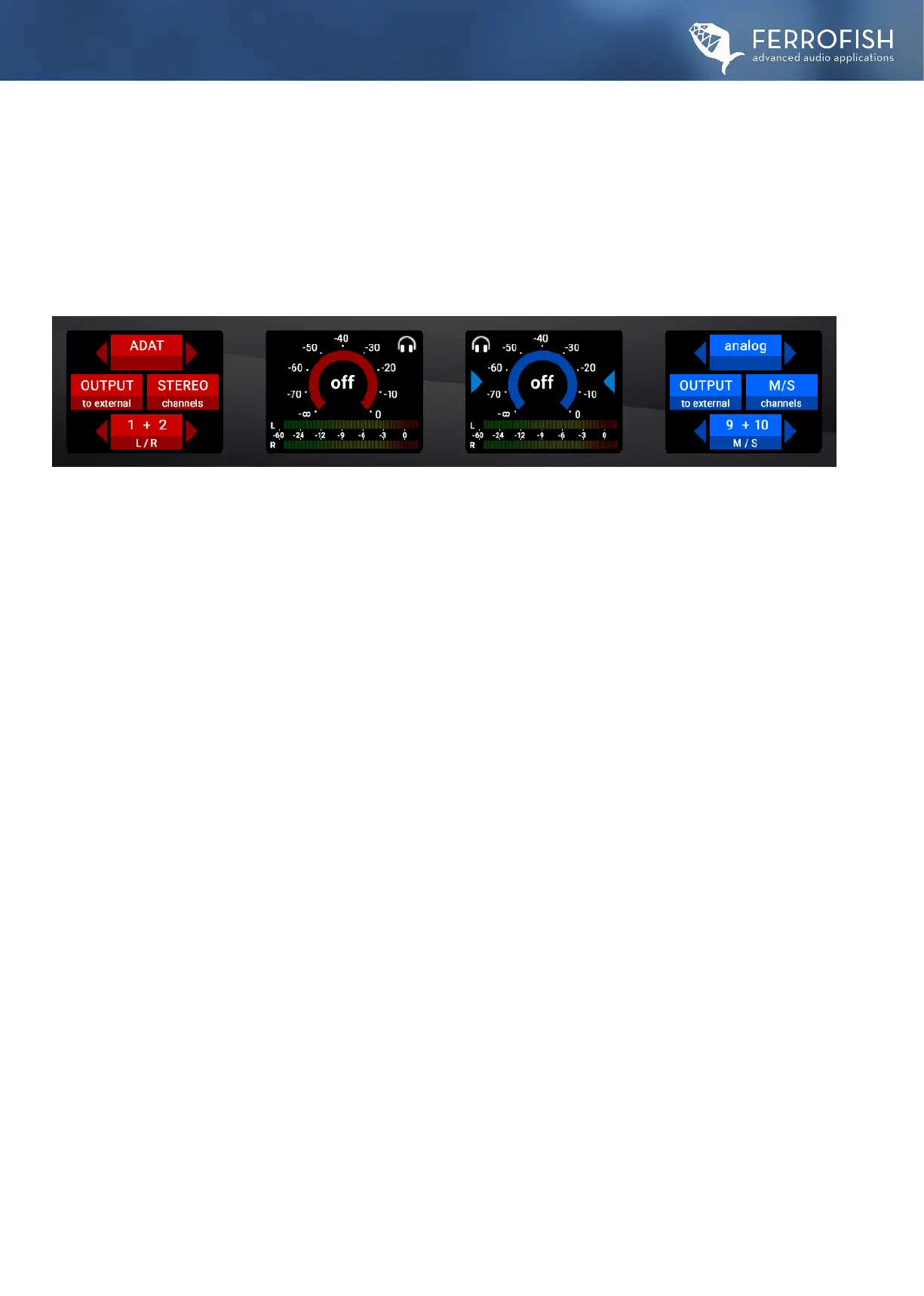 The screens show the two headphone outputs in the color assignment of red for the left output and blue for the right output.