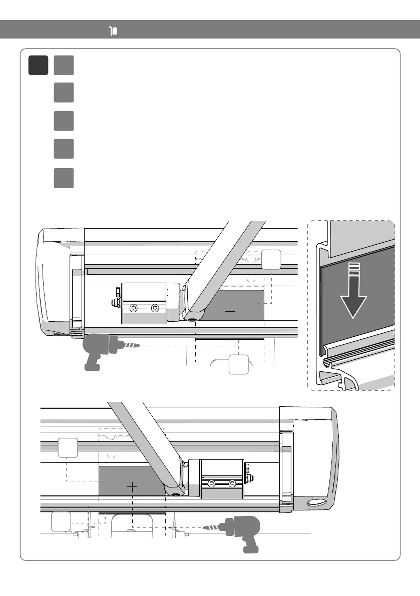Posizionare la dima F sul lato interno del cassonetto allineandola alla staffa di fissaggio D.