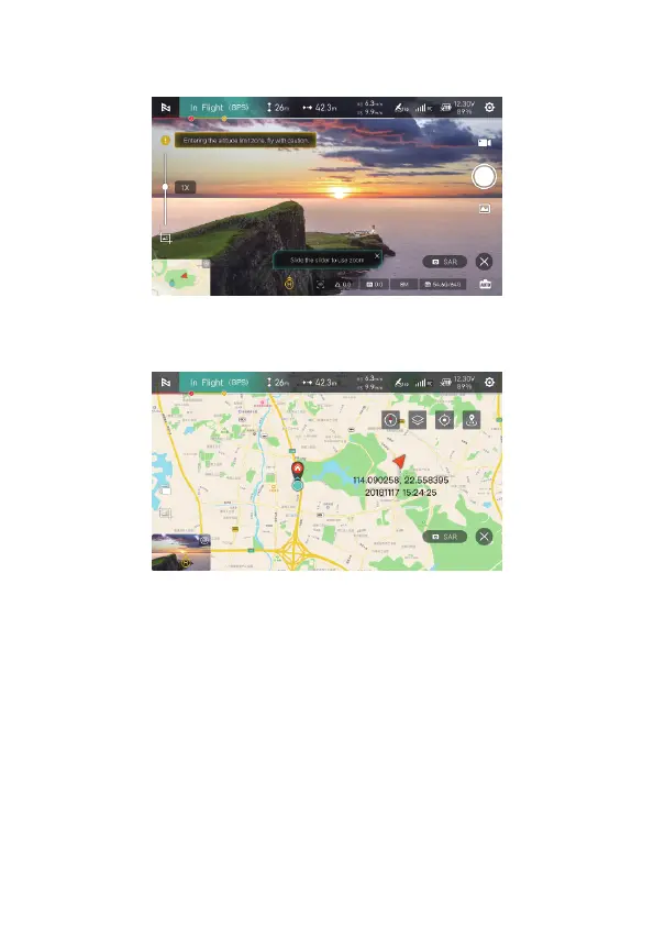 The map interface displays the coordinates of the drone and the current time in real time, and supports