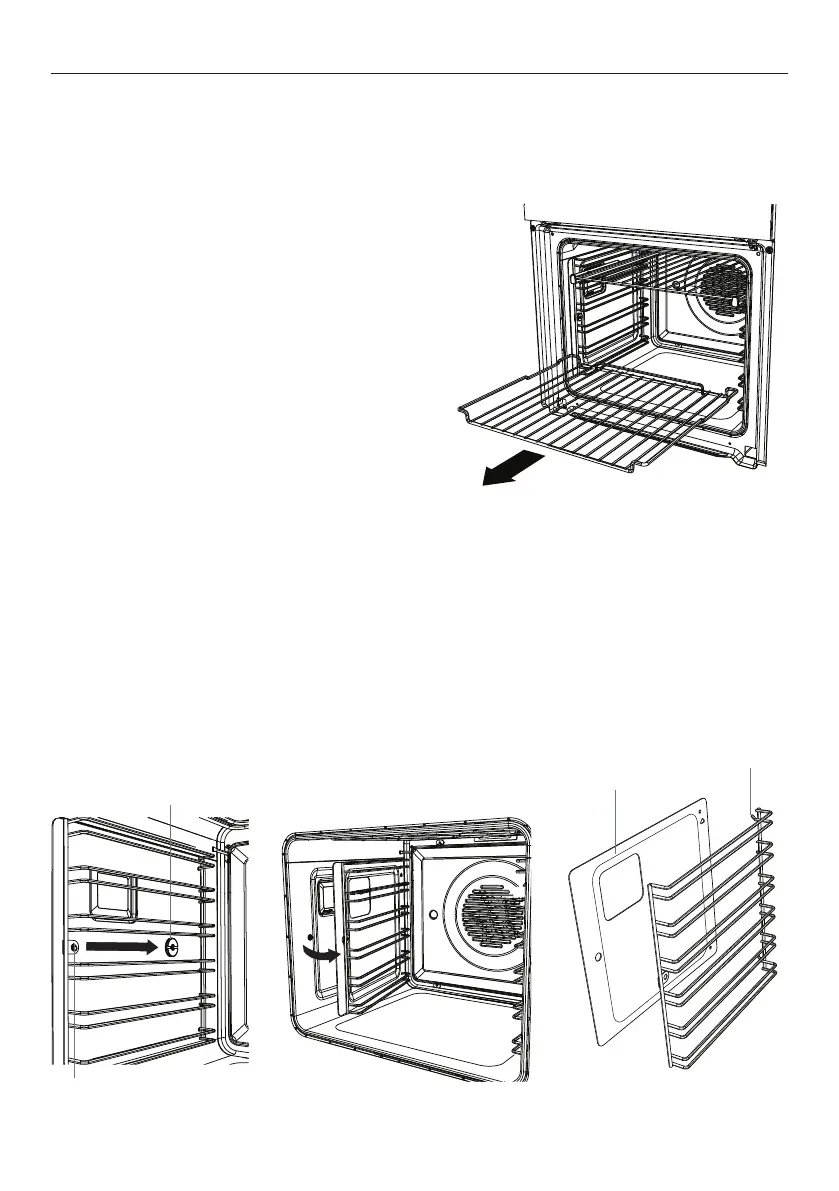 2 Pull the side rack toward the center of the oven until the front tab is clear of the fixing