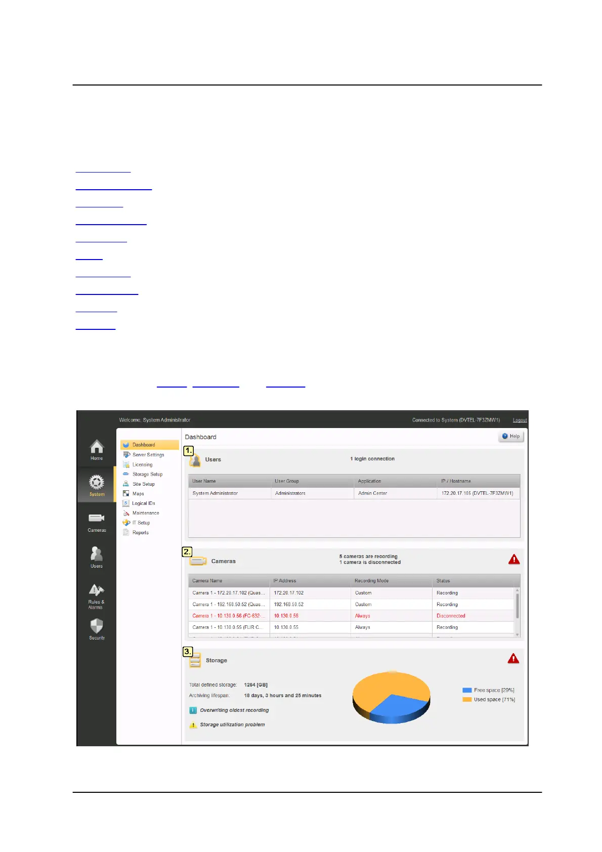 The Dashboard gives a quick status check of the system. The information is divided into