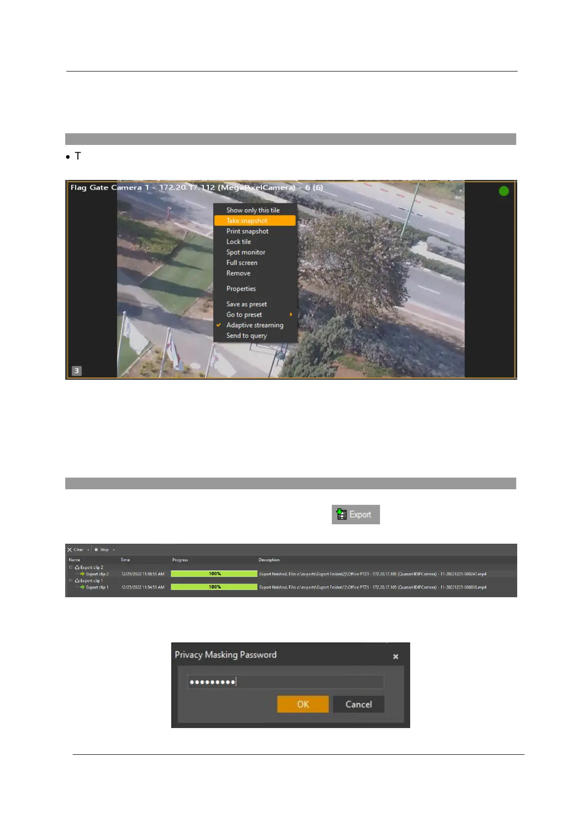 To create a snapshot of video that is displayed in a viewing tile (Live or Playback), right-click in