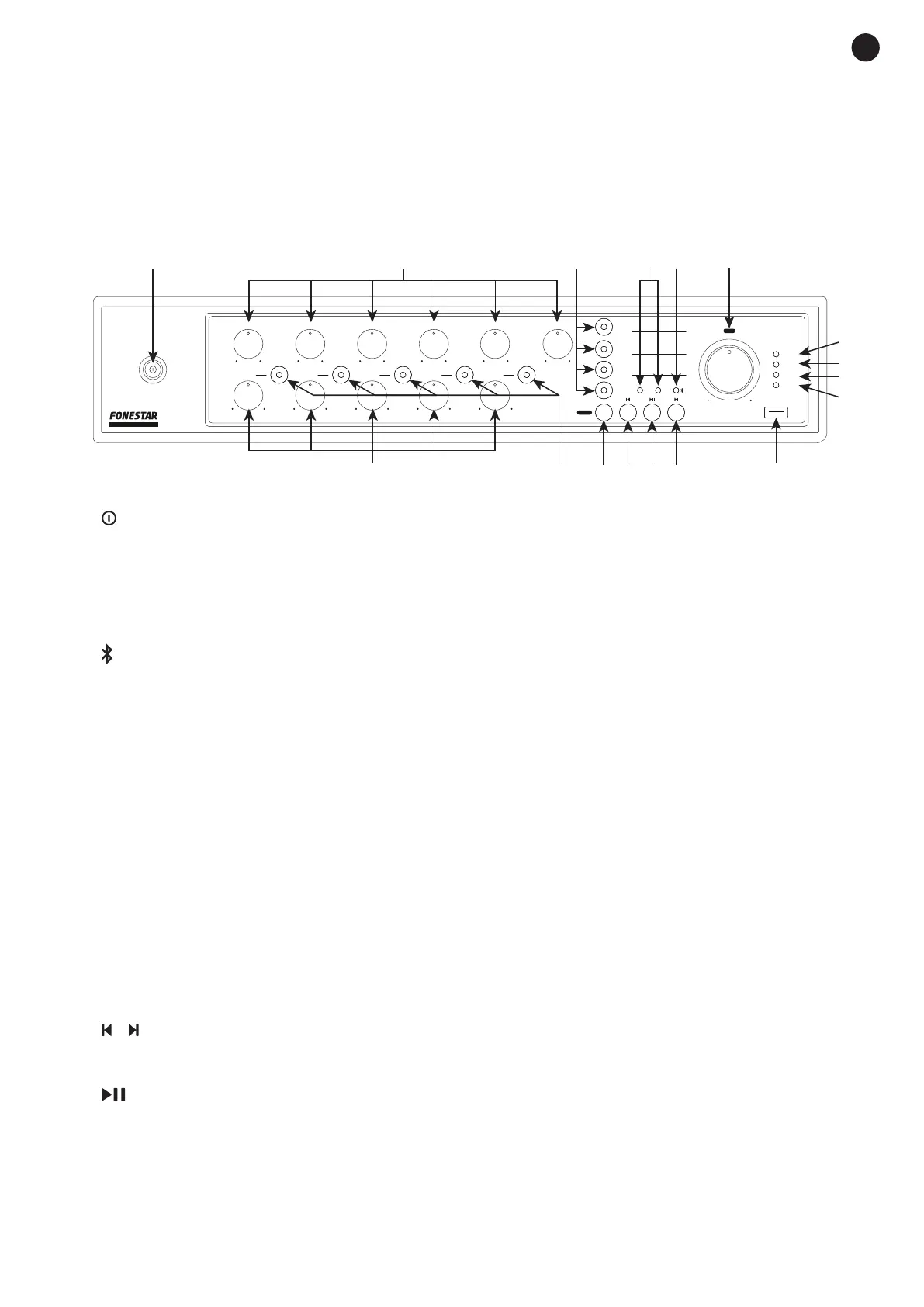 2.- CH 1|PAGING MIC/CH 2/CH 3/CH 4/CH 5/AUX|PLAYER: controles de volumen de las entradas CH 1,