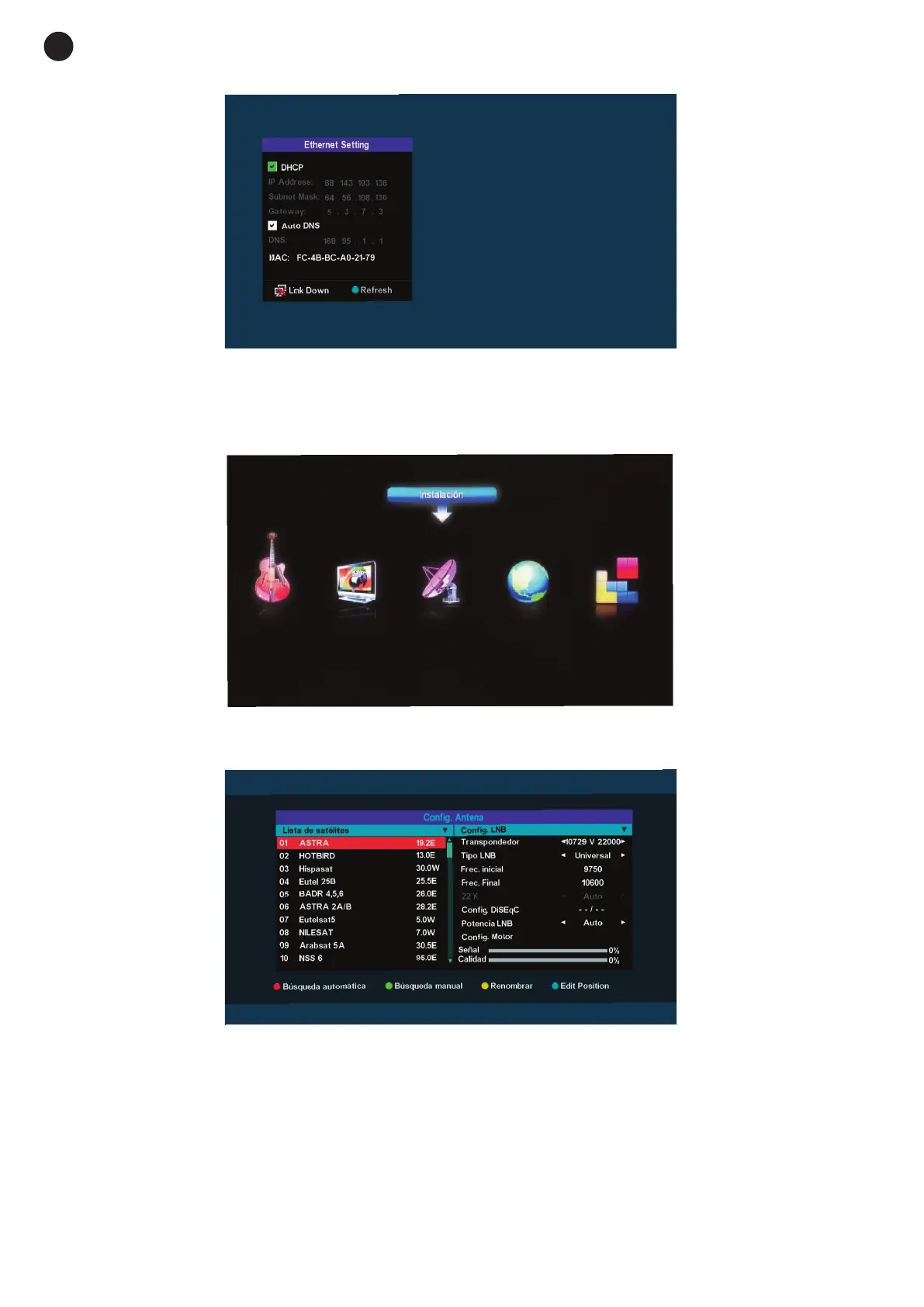 Allows satellite data and LNB information to be configurated for automatic, manual and blind channel