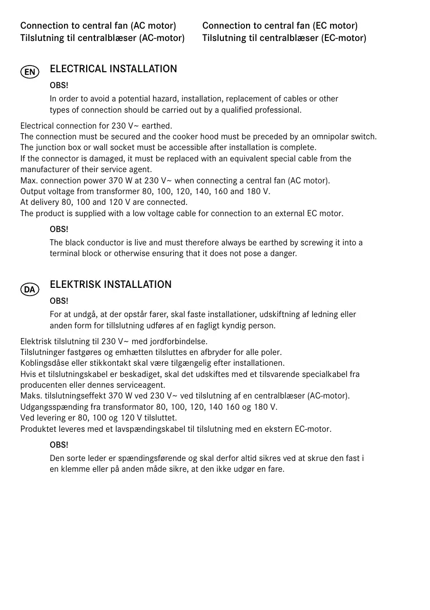 Maks. tilslutningseffekt 370 W ved 230 V~ ved tilslutning af en centralblæser (AC-motor).