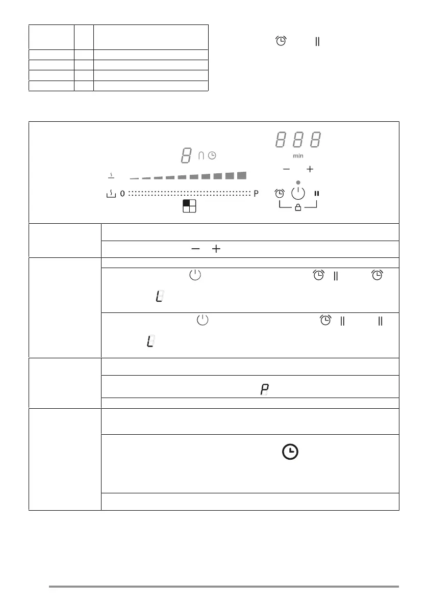 und „-“ drücken, um den Timer einzustellen. Das Symbole der Kochzone leuchtet auf. Ein-