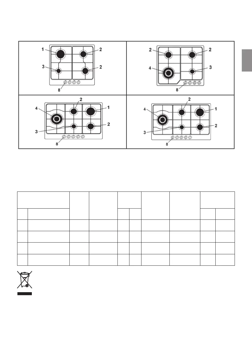 1 Быстрая конфорка 3000 Вт 4 Тройная конфорка 3800 Вт