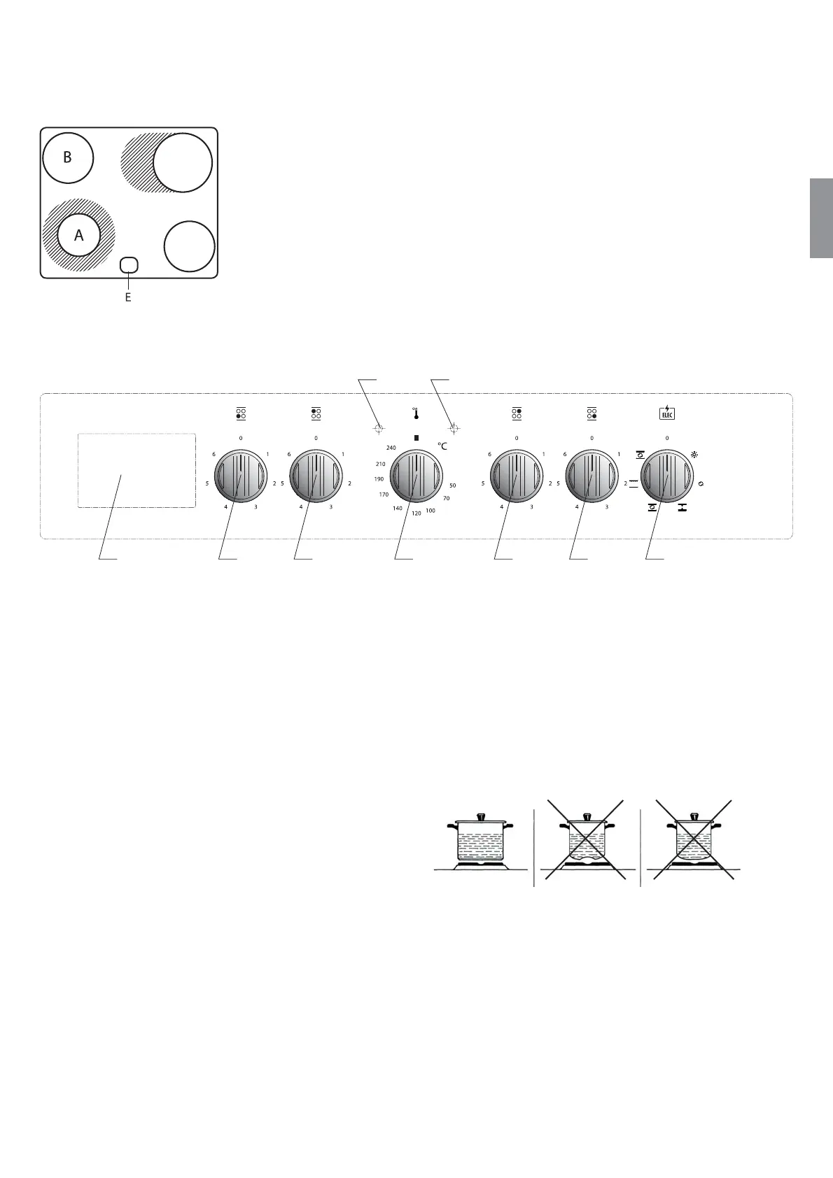 E — ручка включения и регулировки мощности правой задней конфорки;