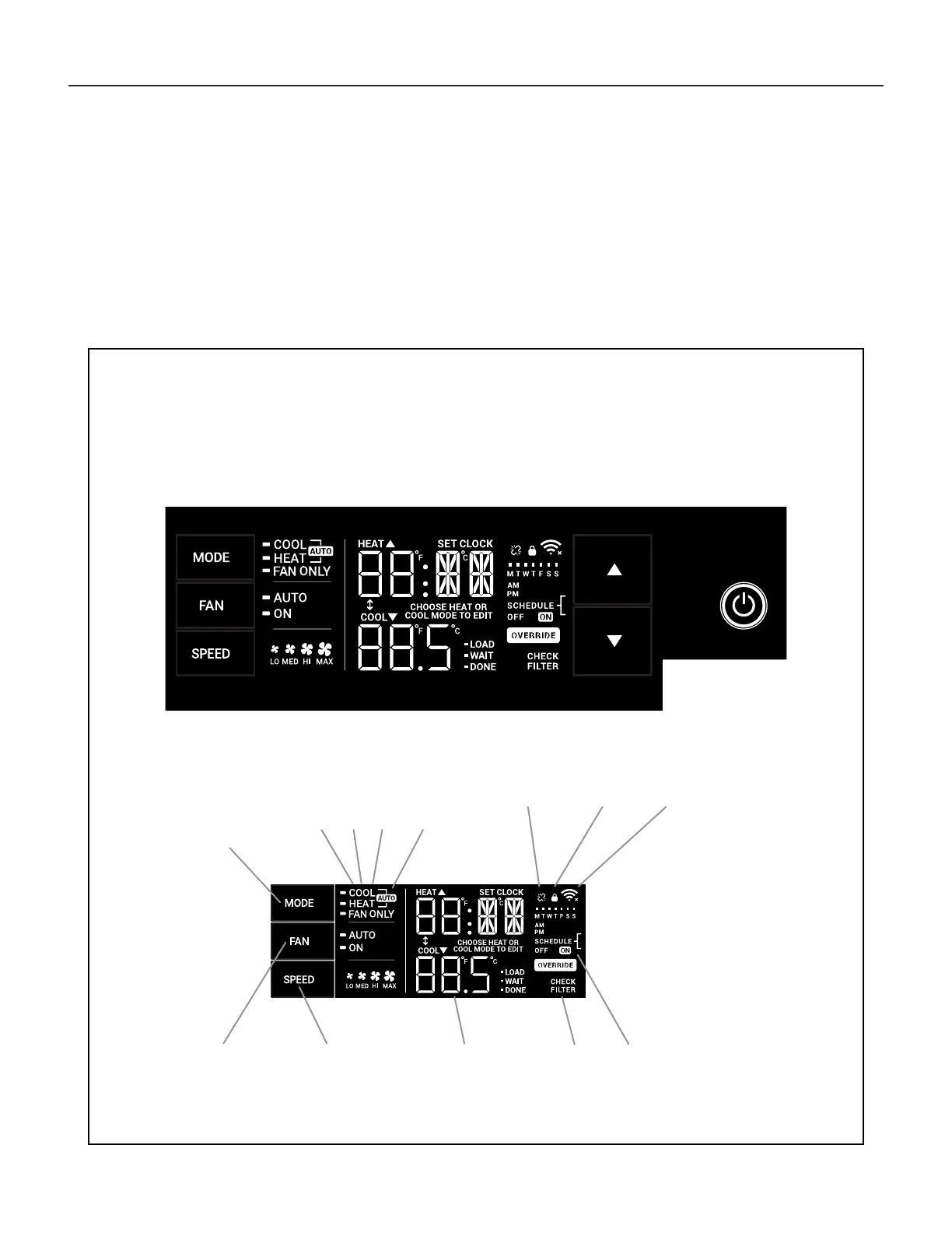 Power On – Press the button to turn on the air conditioner. The power button illuminates to indicate that the power is on. The backlight on the power switch